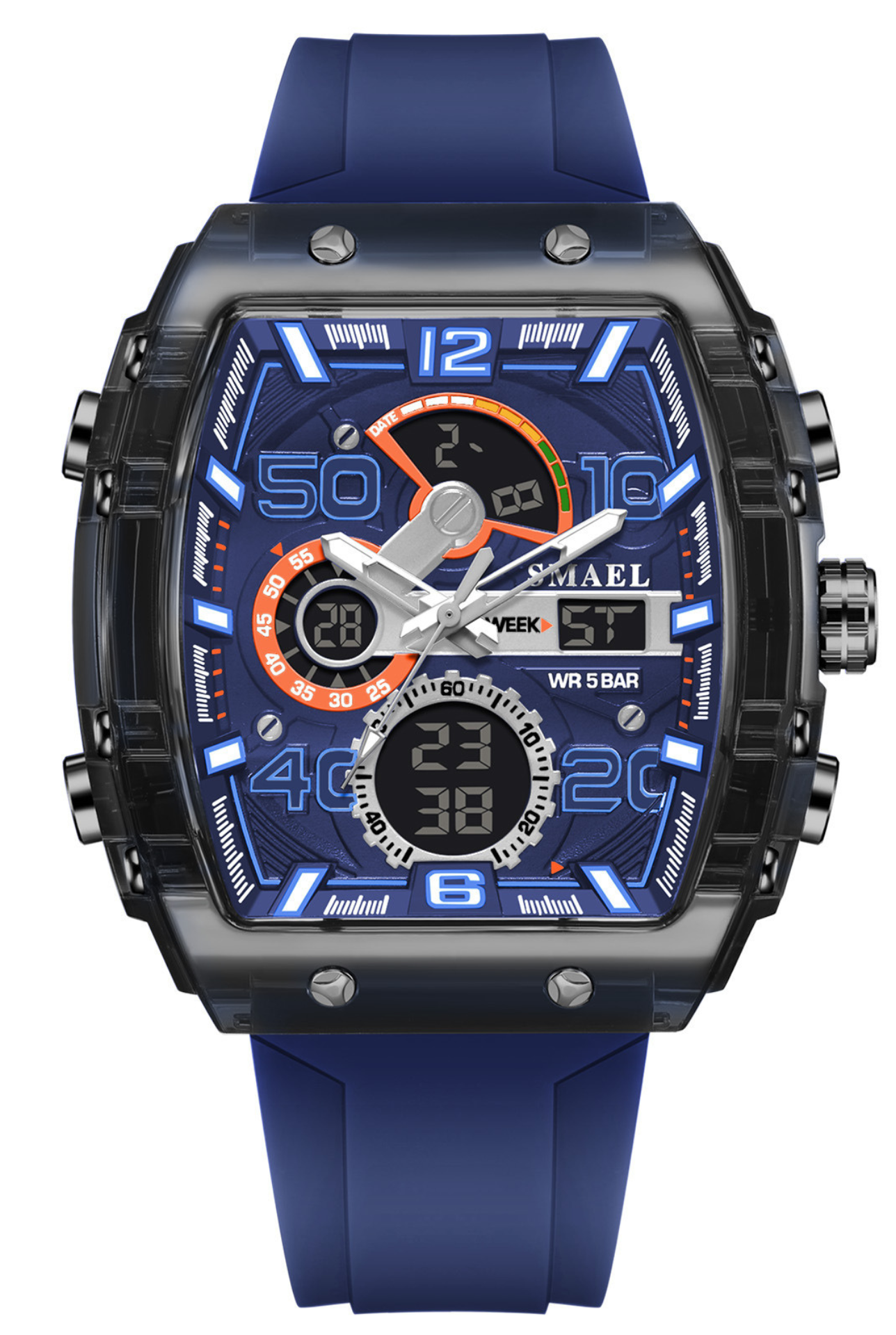 - Caja: Grande, estilo táctico (aprox. 50–55 mm de ancho)