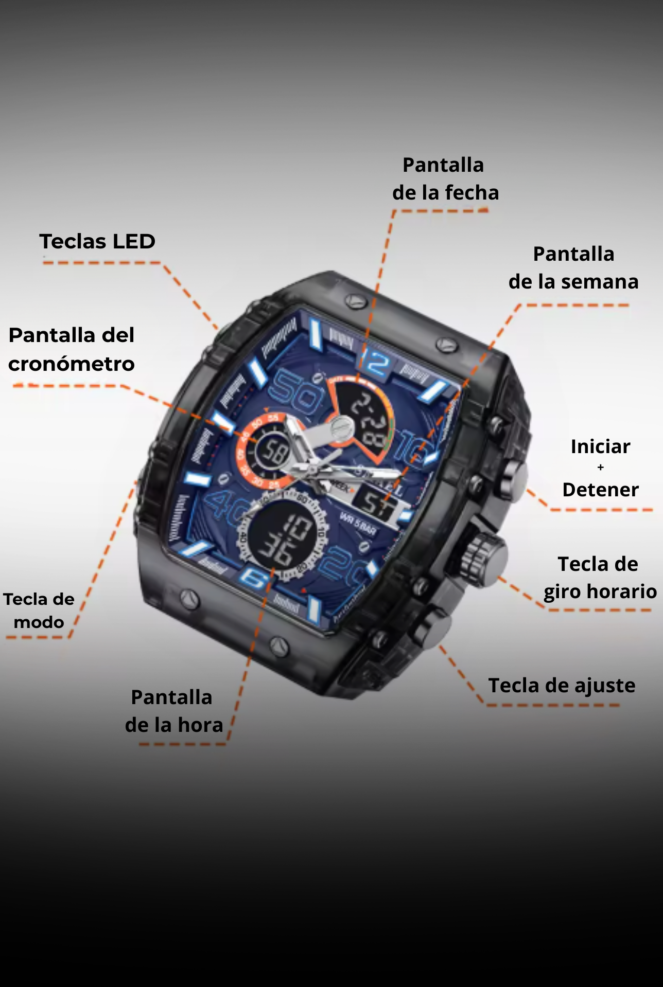 - Tipo: Reloj deportivo analógico + digital